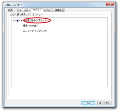 ④プロパティ内のフォントをクリックし、文字が埋め込まれていることを確認してください。